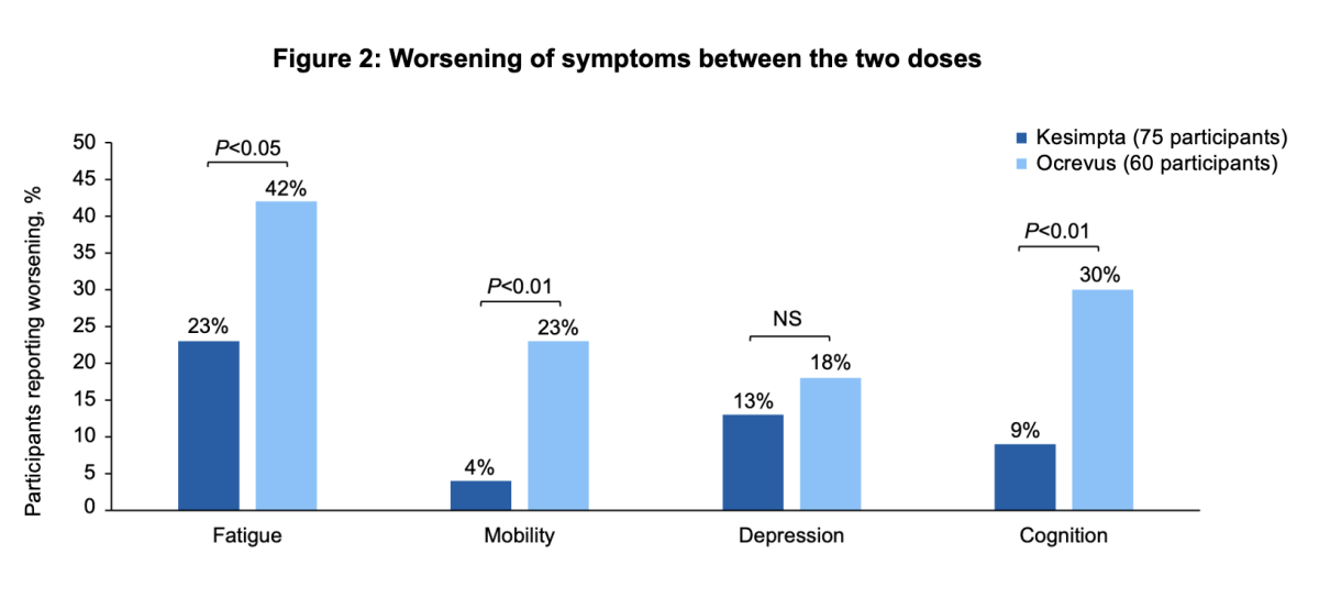 In addition, participants taking Ocrevus were significantly more likely to report worsening of fatigue, mobility (walking) and cognition (thinking and memory) between the two doses than participants taking Kesimpta: